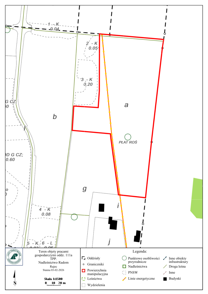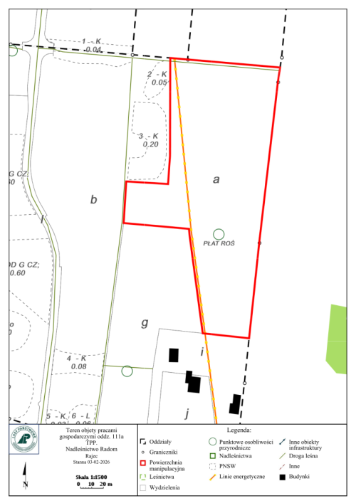 Nadleśnictwo Radom informuje, że w dniach 15.03.2026 - 31.03.2026 w leśnictwie Rajec realizowane będą prace z pozyskania drewna wzdłuż granic z gruntami prywatnymi w oddziale 111a.